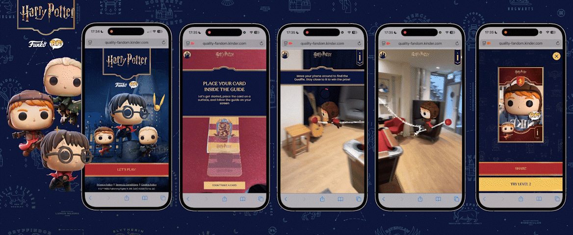 This is a campaign featuring the partnership between Ferrero and the Harry Potter IP, rolled out during Easter season 2025. I worked on the design side and it was a fun chance to relive childhood through the Snitch game, where players could be Harry, Ron, or Draco (depending on the toy they had) and try to catch the Golden Snitch. At the end, they received a shareable social frame that reflected their achievement level.